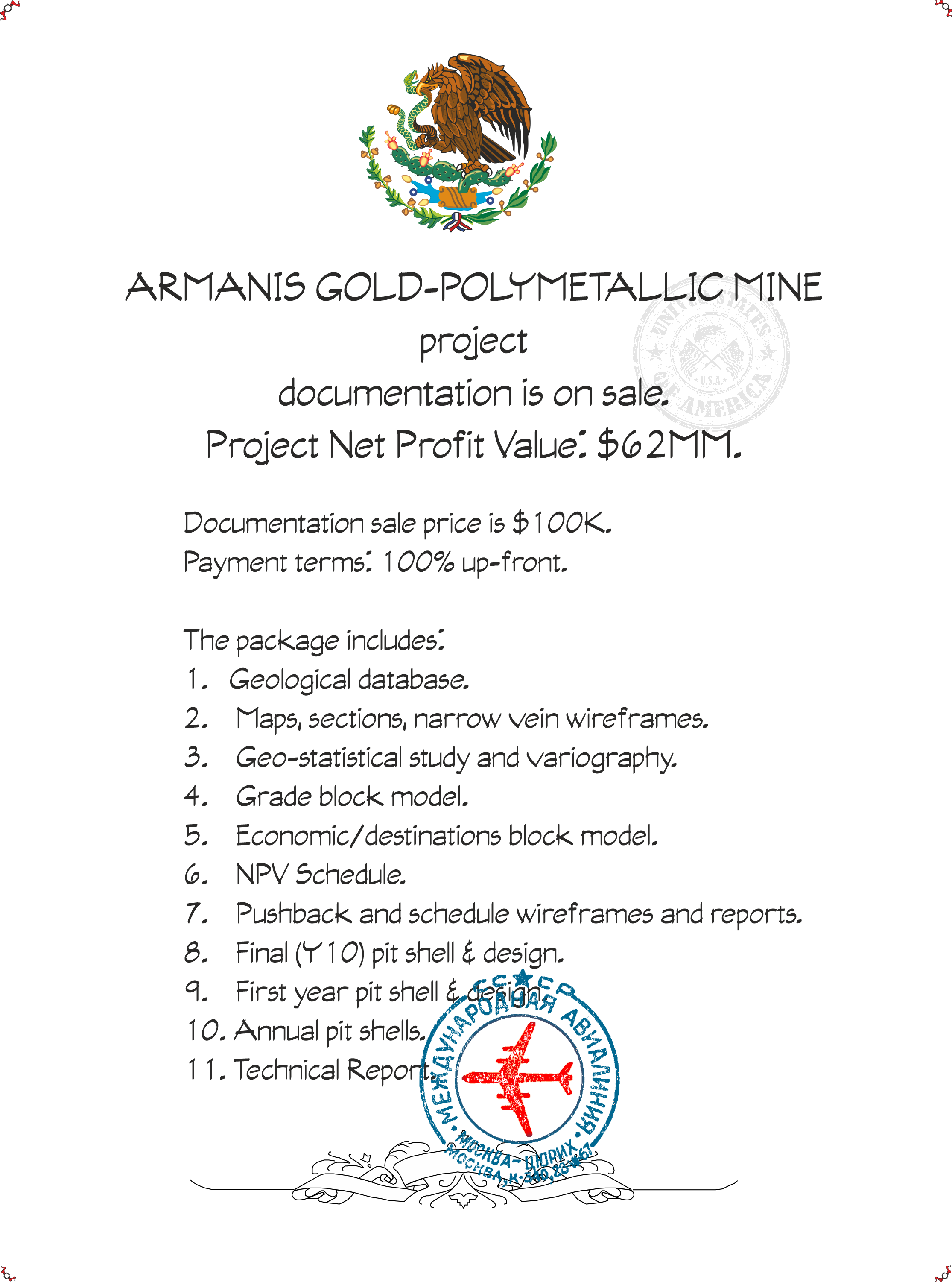 Armanis Gold-Polymetallic Mine is a promising target. With proper management provided, it can bring a lot of welfare to the investors and local community beginning from the first month of operation onwards.